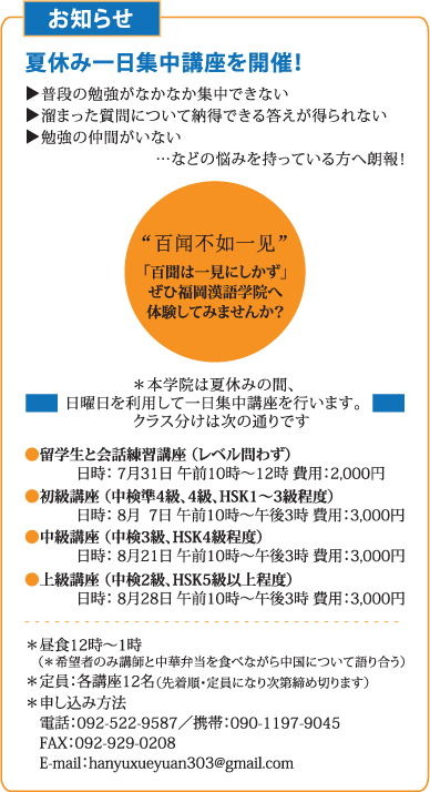 春節午餐宴会のお知らせ 新年好!お健やかに新年を迎えられたこととお慶び申し上げます。下記の通り、2016年春節を迎える午餐宴会を計画いたしました。 中国の本番料理を食べながら、楽器の演奏を聞いて、中国の留学生と一緒に春節を祝いましょう! たくさんのご参加をお待ちしています。(エプロン持参) 記 ![]() 内容:午餐宴会(食べ放題・飲み放題) 楽器・中国語の歌鑑賞 中国留学生との会話 抽選会 日時:2016年2月7日(日)11:30~13:30 場所:太宰府市いきいき情報センター(2F 調理室にて) ※西鉄天神大牟田線「二日市駅」で太宰府ゆきの電車に乗り換え、 「五条駅」で降りるとすぐ(スーパー マミーズの上)駐車場有リ 参加費:一 般 2,000円 (ご家族・お友達大歓迎) 中学生 1,000円 小学生 500円 幼 児 無料 お問合せ:福岡漢語学院 TEL 092-522-9587 携帯 090-1197-9045 お申し込み:各教室及び電話